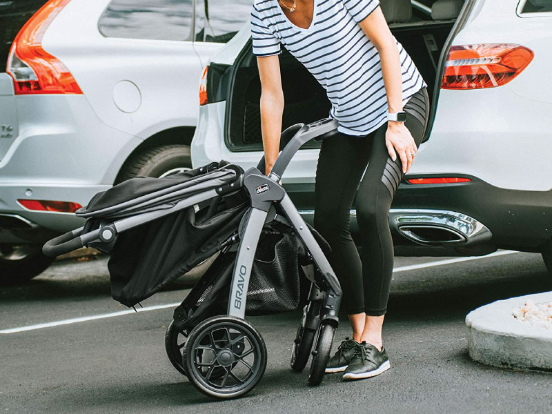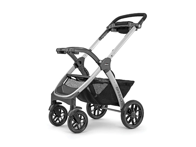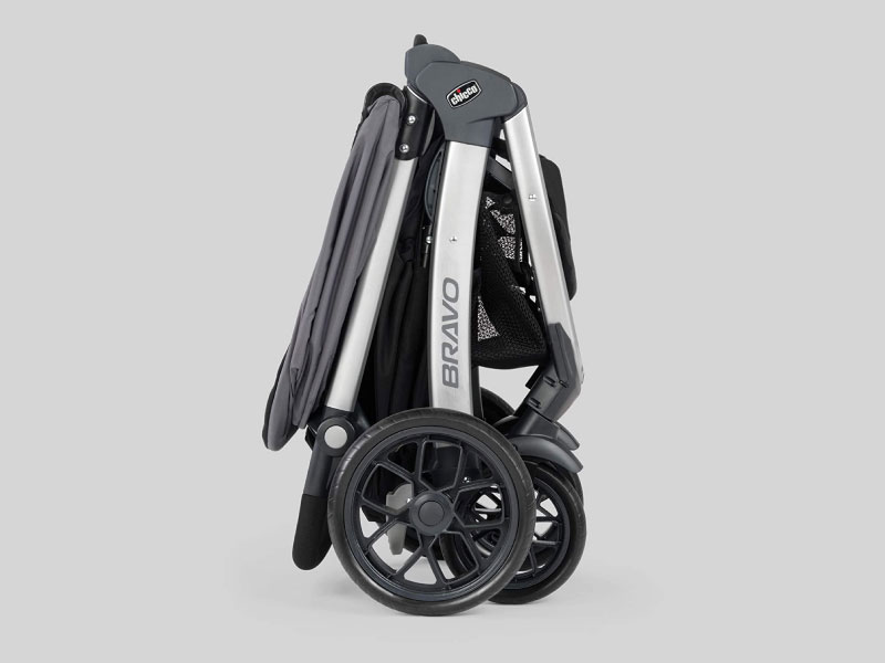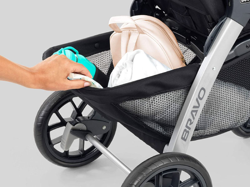 For additional parent convenience, the Bravo® Stroller has a one-hand smart fold with auto-swivel front wheels and stands independently on the wheels without the parent handle touching the ground. The large storage basket features 2 organizer pockets, mesh sides for visibility and easy front & rear access.