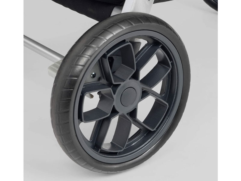 - Large wheels with treaded tires and all-wheel suspension for smooth strolling