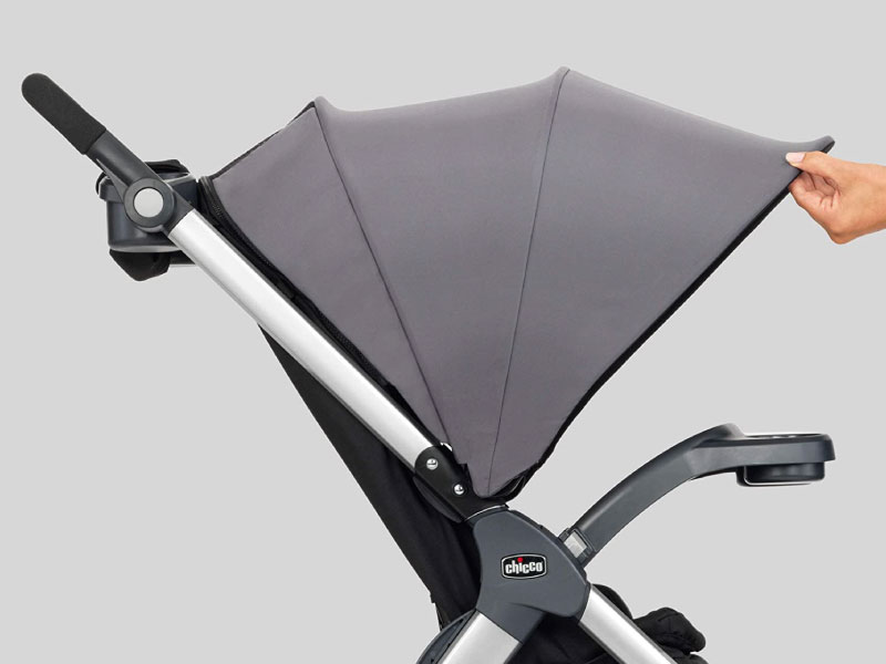 - Large, UPF-rated adjustable canopy with mesh peek-a-boo window